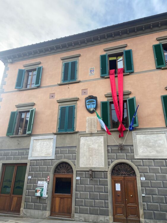 GAIOLE IN CHIANTI.  In occasione della Giornata internazionale per l’eliminazione della violenza contro le donne, anche il Comune di Gaiole in Chianti aderisce all’iniziativa promossa dalla Provincia di Siena, esponendo i drappi rossi sulla facciata del Palazzo comunale. Inoltre tutti i dipendenti del Comune hanno indossato il fiocco rosso.