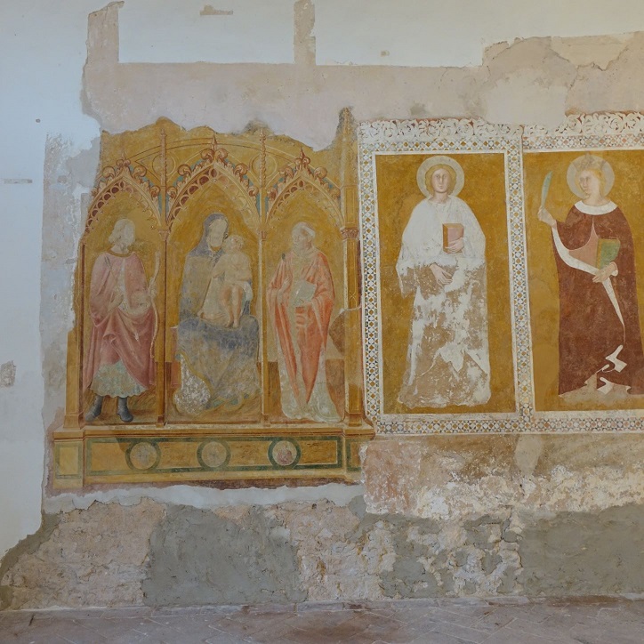 Lungo il lato sinistro della chiesa si vede una finta pala d’altare, alla quale si accostano sul lato destro quattro figure di Santi. La stratificazione degli intonaci permette di stabilire la sequenza esecutiva degli affreschi, partendo dalla pala, che doveva essere in corrispondenza della mensa di un altare laterale. Probabilmente, non potendosi permettere di far dipingere una costosa tavola con fondo dorato, il responsabile di questa commissione scelse la più veloce ed economica soluzione della pittura ad affresco. Un abile maestro riuscì a dipingere un complesso figurativo, che simula con efficace trompe-l’oeil una pala d’altare così come si producevano fra terzo e settimo decennio del Quattrocento. La soluzione prevedeva ancora la tradizionale forma a trittico, consolidatasi nel corso del secolo precedente, ma con l’aggiunta innovativa di una struttura a centina ribassata, che riunisce la sottostante struttura architettonica tripartita. Gli affreschi raffigurano una Madonna in trono col Bambino in piedi sulle sue ginocchia e accompagnata da due santi e nella predella tre tondi con il Cristo in pietà, la Madonna dolente e San Giovanni evangelista dolente. La consunzione della superficie pittorica permette a malapena di riconoscere nella finta pala la figura di San Sebastiano, mentre non è sicuro se possa identificarsi in Magno o nell’evangelista Matteo l’altro santo. Nonostante il compromesso stato di conservazione, i caratteri di stile suggeriscono l’attribuzione al cosiddetto “Maestro di San’Ansano” ossia Nastagio di Guasparre. Potendo acquisire al catalogo di Nastagio anche la pala affrescata di Simignano, avremo una nuova informazione sul suo ruolo di importante comprimario fra i grandi protagonisti della stagione tardogotica senese. Sono invece ancora in fase di decifrazione e di studio le mal conservate iscrizioni sottostanti i Santi, nelle quali si spera di recuperare i nomi dei committenti e la datazione delle opere.
