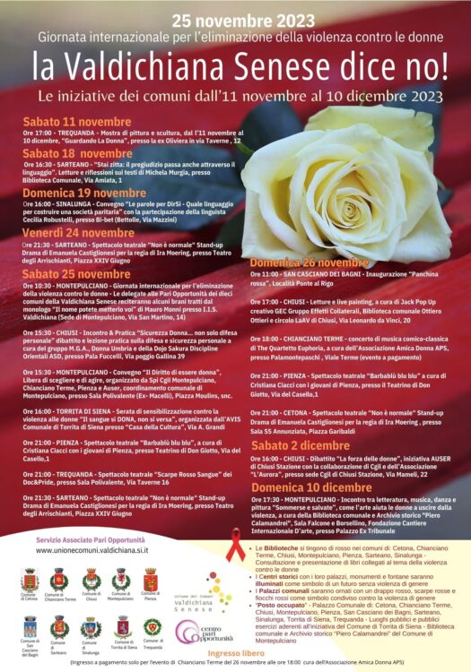 Sabato 25 novembre alle ore 10:30 a Montepulciano presso Istituto di Istruzione Superiore Valdichiana in occasione della Giornata internazionale per l’eliminazione della violenza contro le donne le delegate alle Pari opportunità dei dieci comuni della Valdichiana Senese reciteranno alcuni brani tratti dal monologo “Il nome potete metterlo voi” di Mauro Monni; alle ore 15:30 a Chiusi presso il Pala Fuccelli, in Via Poggio Gallina 39, Incontro & Pratica “Sicurezza Donna… non solo difesa personale” dibattito e lezione pratica sulla difesa e sicurezza personale a cura del gruppo MGA Donna Umbria e dell’ Associazione sportiva Dojo Sakura Discipline Orientali ASD; alle ore 15:30 a Montepulciano presso la Sala Polivalente Ex- Macelli convegno organizzato da Spi Cgil Montepulciano, Chianciano Terme, Pienza e Auser con il coordinamento del Comune di Montepulciano “Il Diritto di essere donna”, Libera di scegliere e di agire; alle ore 16:00 a Torrita di Siena presso “Casa della Cultura” Via A. Grandi serata di sensibilizzazione contro la violenza alle donne “Il sangue si DONA, non si versa” organizzata dall’AVIS Comunale; alle ore 21:00 a Pienza presso il Teatrino di Don Giotto spettacolo teatrale “Barbablù blu blu” a cura di Cristiana Ciacci con i giovani di Pienza; alle ore 21:00 a Trequanda presso Sala Polivalente in Via Taverne 16, spettacolo teatrale dei Doc&Pride “Scarpe Rosso Sangue”; alle ore 21:30 a Sarteano presso Teatro degli Arrischianti spettacolo teatrale “Non è normale” Stand-up Drama di Emanuela Castiglionesi per la regia di Ira Moering.