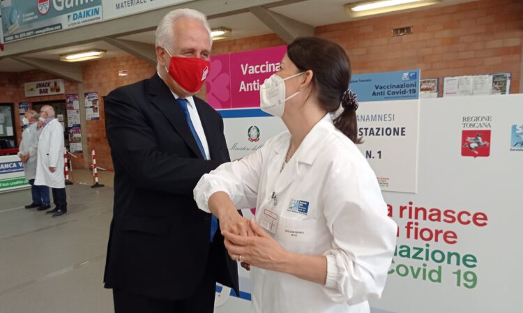 giani: il saluto tra il presidente della Regione Eugenio Giani e una dottoressa all’arrivo al centro vaccinale