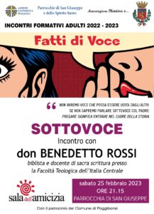 La seconda conferenza, prevista per sabato 25 febbraio, alle ore 21,15, sarà tenuta da don Benedetto Rossi. Il relatore, formatosi a Siena, è rettore del santuario di Santa Caterina ed esperto di studi sulla grande santa senese, patrona di Italia, ma è ancora più noto come biblista e docente di Sacra Scrittura presso la Facoltà Teologica dell’Italia Centrale. È anche un grande organizzatore di viaggi in Terra Santa, dove pure svolge un’intensa attività di studio. Il tema da lui trattato sarà Sottovoce: il senso della preghiera, oggi.