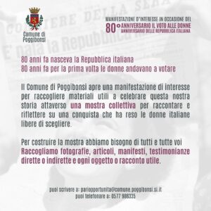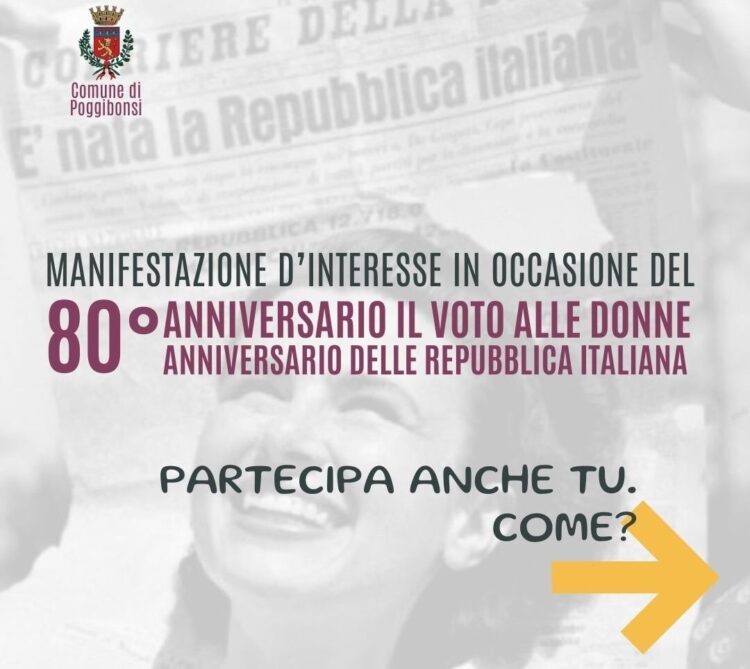 Chi può partecipare. La manifestazione di interesse è aperta a tutti e tutte, cittadini, cittadine, associazioni, sindacati, partiti politici, chiunque sia in possesso di materiale e documentazione attinente al tema con particolare riferimento a: elezioni amministrative del 10 marzo 1946: immagini di donne alle urne, comizi elettorali locali o scene di vita pubblica nel comune, fotografie, manifesti, oggetti, documentazione varia; referendum del 2 giugno 1946: fotografie della partecipazione al voto per la scelta tra Monarchia e Repubblica, ma anche manifesti, oggetti, documenti vari; contesto sociale del dopoguerra a Poggibonsi: fotografie di lavoratrici, studentesse o figure femminili impegnate nella ricostruzione della comunità poggibonsese; prime elette: documentazione varia relativa alle prime donne entrate a far parte del Consiglio Comunale o dell’amministrazione locale.