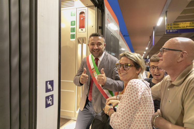 CHIUSI. Il sogno è diventato realtà ieri sera alle ore 21.07 quando dal binario uno, in lontananza, si è vista apparire la sagoma dell’ETR 1000 Frecciarossa rallentare e poi fermarsi alla Stazione di Chiusi. L’arrivo del treno è stato atteso da oltre 500 persone con in testa il sindaco Juri Bettollini, visibilmente emozionato, le altre autorità istituzionali e la Filarmonica Città di Chiusi, che ha intonato un inno composto appositamente per l’occasione dal maestro Roberto Fabietti. I pochi minuti di sosta del Frecciarossa 9570, partito da Napoli, passato per la Capitale e fermato a Chiusi, sono stati attimi di vera e propria festa sia per le tante persone che hanno atteso sulla banchina del binario sia per i passeggeri del treno, increduli nel vedere la tanta gioia che li ha accolti alla Stazione di Chiusi. La festa per la fermata del primo Frecciarossa, sul quale sono saliti proprio da Chiusi anche alcuni passeggeri diretti a Firenze e Milano, non è terminata con la ripartenza del treno, ma è proseguita in Piazza Dante (di fronte alla stazione) dove sono intervenute le autorità istituzionali presenti. Per l’arrivo del primo Frecciarossa, oltre a tanti cittadini, erano presenti il sindaco Juri Bettollini e gli assessori della giunta, tanti sindaci della Valdichiana senese e dei Comuni dell’Umbria, l’assessore della Regione Toscana ai trasporti Vincenzo Ceccarelli, il consigliere regionale Stefano Scaramelli, l’ex viceministro Riccardo Nencini oltre all’attrice Cristina Capotondi. Il primo a prendere la parola è stato il sindaco Juri Bettollini che, con sapiente ironia, ha rotto il ghiaccio con un video tratto dal film “Il ragazzo di campagna” con Renato Pozzetto e la celebre battuta “Il treno è sempre bello”