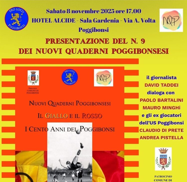 SIENA. Sabato 8 novembre alle 17 presso la Sala Gardenia dell’Hotel Alcide sarà presentato il numero 9/2025 dei Nuovi Quaderni Poggibonsesi dal titolo Il giallo e il rosso. I cento anni del Poggibonsi. Il volume esce come ulteriore edizione speciale 2025, in occasione del centenario dell’istituzione della squadra di calcio cittadina.