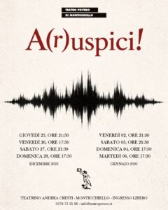 Spostandoci a Monticchiello, infine, il Teatro Povero va in scena il 2, 3, 4 e 6 gennaio nel Teatrino Andrea Cresti con “A(r)uspici”, spettacolo invernale della Compagnia Popolare, una versione più raccolta e più “antica” del celeberrimo spettacolo estivo.