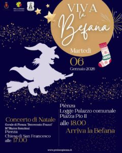 Con l’Epifania si replica, nella Chiesa di San Francesco, il Concerto di Natale della Corale di Pienza “Benvenuto Franci” e, subito dopo, la Pro Loco accoglierà le Befane sotto le Logge del Comune, facendo felici figli e genitori.