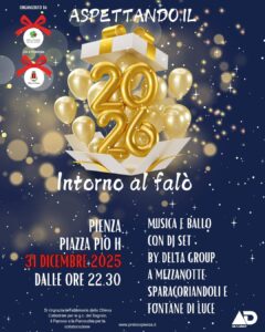 Il cartellone natalizio pientino prosegue con la notte di San Silvestro, in cui la Pro Loco Pienza farà ballare Piazza Pio II dalle 22:30, insieme ai Deltagroup, salutando il 2026 con fontane di luci.
