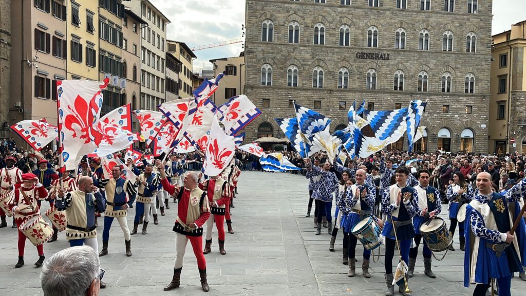 Prima della firma delle pergamene si è svolto un lungo e suggestivo corteo che ha toccato Piazza della Repubblica, Piazza del Duomo, Via dei Calzaiuoli fino a Piazza della Signoria, dove i due gruppi sbandieratori e la rappresentanza della Repubblica fiorentina, si sono disposti, per dare vita ad un’ora di spettacolo di bandiere, con tamburi e chiarine. Di fronte ad una Piazza della Signoria gremita di turisti e cittadini. Gran finale con lancio di bandiere biancazzurre dei Canneti e con il giglio fiorentino dei bandierai, per uno spettacolo unico che ha tenuto con il fiato sospeso ed emozionato gli astanti.