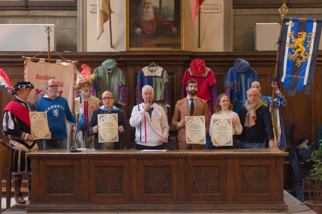 SAN QUIRICO D’ORCIA. Firmate le pergamene che hanno sancito il gemellaggio ufficiale fra il Quartiere di Canneti di San Quirico d’Orcia e i Bandierai degli Uffizi di Firenze. La cerimonia che, oltre che dei rappresentanti delle due realtà di rievocazione storica, ha visto la presenza delle istituzioni dei due comuni – l’assessora alle tradizioni popolari del Comune di Firenze, Letizia Perini, e il sindaco di San Quirico d’Orcia, Marco Bartoli -, si è svolta nel Salone Brunelleschi di Palagio di Parte Guelfa, sede dei Bandierai degli Uffizi e storico edificio fiorentino (già sede del partito guelfo negli anni di scontro con i ghibellini).