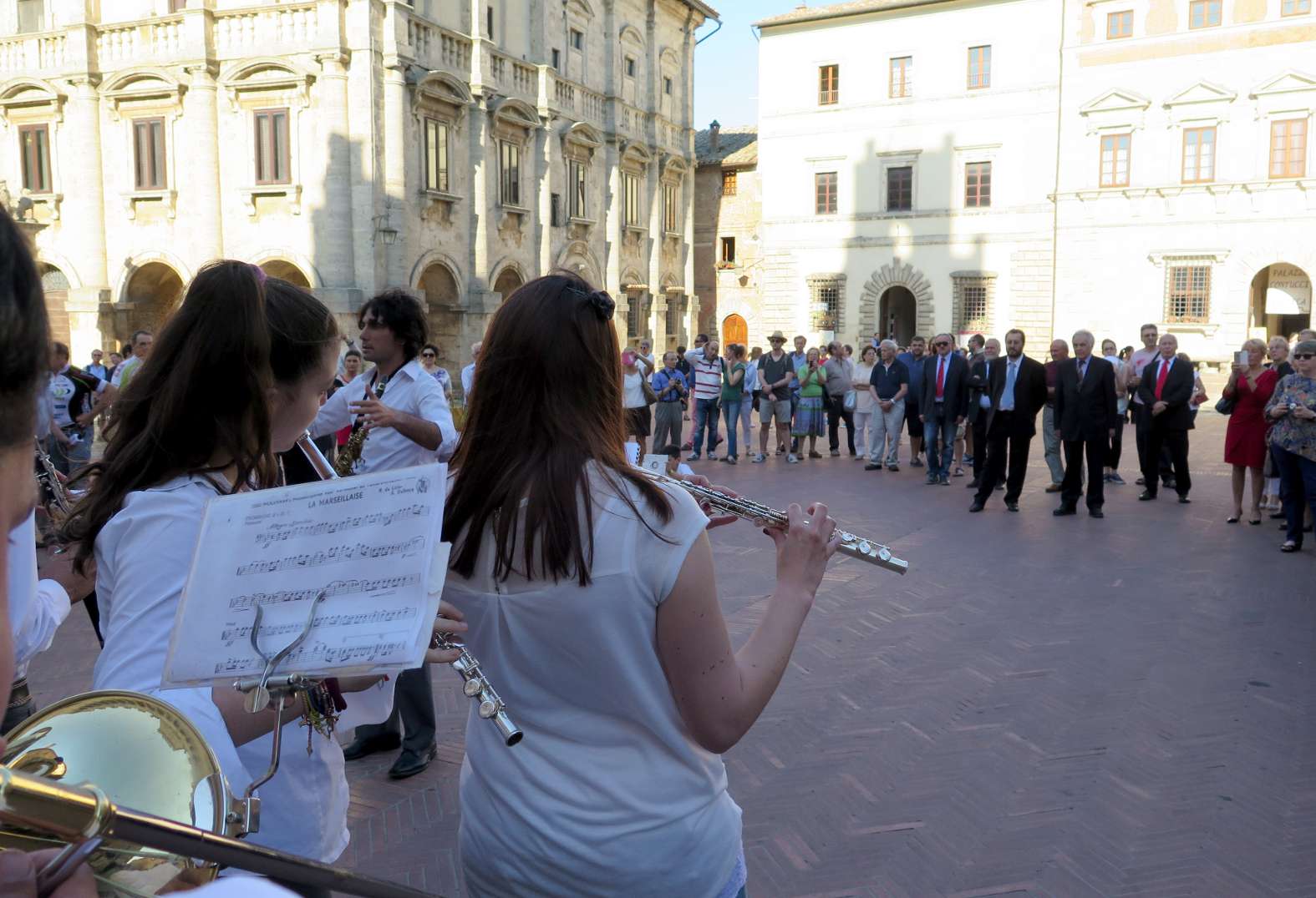 A rappresentare le due comunità, dal primo, cordialissimo, incontro in Piazza Grande fino al convivio che ha concluso la giornata, i sindaci Pierre André Perissol e Andrea Rossi. Centinaia di persone hanno assistito all’esibizione della Banda dell’Istituto di Musica “Henze”, terminata con l’emozionante esecuzione della Marsigliese e dell’Inno di Mameli. Ospiti francesi in visibilio di fronte ai numeri del Gruppo Sbandieratori e Tamburini del Bravìo delle Botti, favoriti dal clima estivo, e poi l’incontro nel luogo più istituzionale, la Sala Consiliare del Palazzo Comunale con i saluti e lo scambio dei doni.