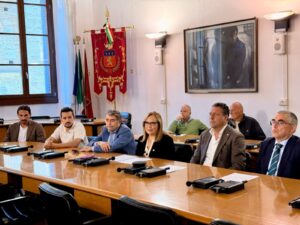 Nella foto al tavolo da sinistra Francesco Bruschettini, Francesco Rossi, Marco Turillazzi, Susanna Cenni, Alessandro Fabbrini, Cristiano Iacopozzi (ChiantiBanca). Nell’altra fila Andrea Agresti e Ilio Bruni (US Poggibonsi).