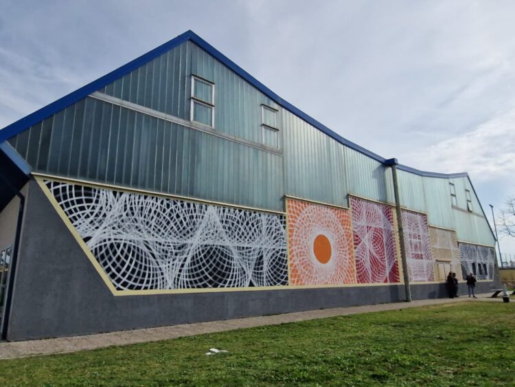L’intero progetto è curato da Carolin Angerbauer (Culturing APS) e Gian Guido Grassi (Start Attitude). La prima opera presentata è quella realizzata dall’artista Moneyless nel Comune di Sinalunga. Si tratta di una pittura murale dipinta sulla facciata del palazzetto dello sport di Sinalunga trasformando uno spazio pubblico quotidiano in un vero e proprio punto di riferimento artistico per la comunità. L’intervento sviluppa un linguaggio geometrico di ispirazione optical, dove ritmo e colore si intrecciano come fili di un tessuto visivo. Le trame, ottenute attraverso moduli ripetitivi e variazioni cromatiche, evocano la complessità della società contemporanea: una rete di relazioni, connessioni e contrasti che convivono in equilibrio dinamico. L’opera invita lo sguardo a muoversi, a cercare un ordine nel movimento e una forma nel caos, trasformando l’architettura in una superficie pulsante di energia e significato. Moneyless, con la sua opera va a instaurare un dialogo profondo tra arte contemporanea e architettura urbana. L’intervento, oltre a valorizzare l’edificio, contribuisce così a ridefinire il paesaggio visivo del luogo, rendendolo più dinamico e stimolante, e invitando cittadini e visitatori a una nuova percezione dello spazio.