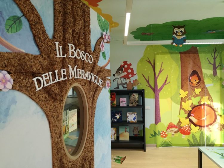 Nel dettaglio la porta di accesso all’area dedicata ai bambini è stata trasformata in una porta speciale da cui si accede alla Biblioteca Incantata. Qui sono stati riorganizzati gli albi, identificabili per età di riferimento, e la cui fruizione è stata resa più semplice e visibile (vi è anche lo scaffale Nati per Leggere). La novità principale riguarda però la creazione, all’interno della Biblioteca Incantata, della stanza “Il Bosco delle Meraviglie” a cui si accede da una porta speciale, una grande copertina di un libro che introduce piccoli e grandi in un ambiente suggestivo dove si possono vivere insieme esperienze ed emozioni nuove e positive che predispongono all’accoglienza e al superamento dei conflitti. Grazie a pellicole adesive sulle pareti, realizzate da professionisti, “Il Bosco delle meraviglie” si trasforma in un grande libro all’interno del quale è possibile entrare, fermarsi e raccontarsi delle storie. Strumento che rende possibile tante trasformazioni (come vedere gli storici nemici delle fiabe che si riscoprono amici davanti ad un libro) ma anche strumento che unisce, che fa gruppo, che facilita lo stare assieme. Ed ecco che sulle ‘pagine’ decorate della grande parete troviamo Biancaneve che legge un libro ai sette nani che le stanno tutti attorno attenti ed incuriositi. Non mancano tanti animaletti magici e non, come l’uccellino-corriere che porta nel becco un libro chiesto in prestito e il leocorno, simbolo della fantasia, che si taglia sullo sfondo.
