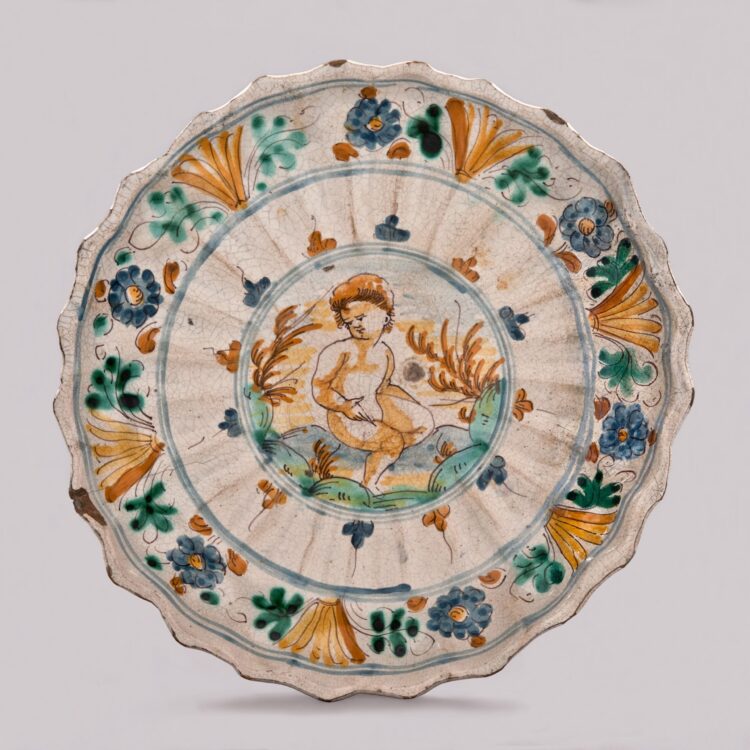 Anche le tre acquasantiere, una completa e due frammentate, potevano essere utilizzate da religiosi, ma era prassi comune collocarle anche in ambienti domestici. In monocromo azzurro sono decorati inoltre due orcioli, destinati alla conservazione di medicamenti ed evidentemente realizzati per una spezieria o una infermeria, come indica il contenuto di uno di essi, lo Sciroppo di Sugo di Acetosa. Per essi è plausibile la provenienza dalla manifattura di Fonte alla Vena, durante la gestione del vasaio di origine genovese Stefano Grogio, che nel 1712 aveva preso in affitto la fornace per due anni. A chiudere cinque oggetti presumibilmente legati all’attività del noto pittore romano Bartolomeo Terchi, che per quasi otto anni, dal gennaio 1717 fino agli ultimi mesi del 1724, condusse la vaseria di Fonte alla Vena, affidatagli dai Chigi Zondadari, per spostarsi poi a Siena e quindi a Bassano di Sutri nella prima metà degli anni Trenta. Si tratta anzitutto di un piattino istoriato; ci sono poi due piastre ovali con raffigurati personaggi tratti da incisioni di Giovanni Battista Galestruzzi (1615-1669), destinate ad essere incorniciate in biscotto dorato o patinato per servire da elementi d’arredo; infine, tre piastrelle con i tipici paesaggi con viandanti, caratteristici di certa produzione terchiana, sfornata principalmente a Bassano di Sutri, e destinate alla decorazione d’interni.