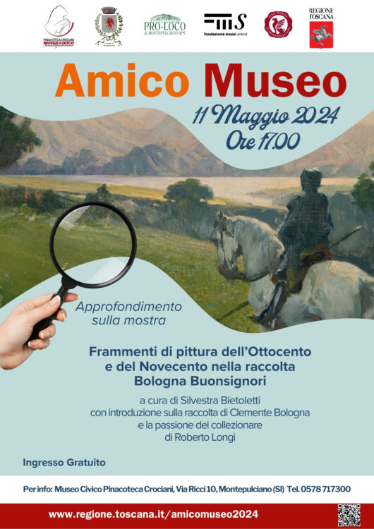 MONTERIGGIONI. Segnaliamo gli eventi previsti per questo fine settimana al Museo Civico Pinacoteca Crociani di Montepulciano. Sabato 11 maggio, alle ore 17.00 si terrà l’evento gratuito per l’edizione 2024 di Amico Museo. Quest’anno il tema scelto da Regione Toscana è “Musei per la didattica e la ricerca”. Per tale ricorrenza, il Museo prevede un approfondimento sulla mostra temporanea “Da Palizzi a Severini. Pittori italiani tra Ottocento e Novecento nella raccolta Bologna Buonsignori” a cura di Silvestra Bietoletti e del Direttore Roberto Longi. Gino Severini, Filippo Palizzi, Lionello Balestrieri, Angiolo Tommasi, Giuseppe Stuart, Giuseppe Viner, Aleardo Paolucci, Paride Pascucci sono alcune delle firme che compongono la ricca collezione Bologna Buonsignori che può essere ammirata fino al prossimo 23 giugno. Una mostra che consente di ammirare il lavoro di artisti che, pur attraversando fasi e stili diversi, rappresentano un patrimonio significativo della pittura italiana a cavallo tra ‘800 e ‘900. Al termine della mostra guidata, seguirà un piccolo rinfresco offerto dalla Pro Loco, con i vini offerti dal Consorzio del Vino Nobile di Montepulciano.