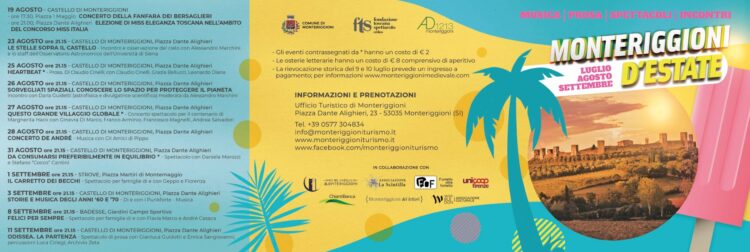 «Una fitta e articolata proposta di spettacoli tra piazza Dante e le frazioni di Monteriggioni per coinvolgere ed incuriosire appassionati e spettatori di tutte le età, a cominciare dalle famiglie. È un’offerta di chiaro livello qualitativo – sottolinea il direttore della Fondazione Toscana Spettacolo onlus, Patrizia Coletta – quella che abbiamo condiviso con l’Amministrazione comunale: Andrea Pennacchi, Daniela Morozzi, Ginevra Di Marco e Franco Arminio, Nicola Zavagli, Andrea Zorzi e Beatrice Visibelli, Paolo Benvegnù, I Sacchi di Sabbia sono solo alcuni dei protagonisti di un cartellone che si protrarrà fino a settembre per arricchire di contenuti artistici uno dei borghi più affascinanti d’Italia».
