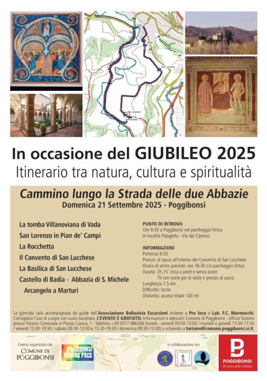 POGGIBONSI. Poggibonsi rende omaggio al Giubileo e investe sul turismo lento con itinerari originali che si snodano tra natura, cultura e spiritualità. Dopo il successo di “Camminando fra una Villa e un Eremo” è in programma, domenica 21 settembre, il secondo appuntamento dal titolo “Cammino lungo la Strada delle due Abbazie”.