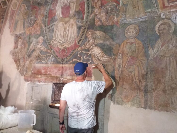 PIANCASTAGNAIO (SIENA) – Otto studenti provenienti da Stati Uniti, Canada e Cina e una celebre restauratrice e storica dell’arte, Roberta Lapucci, hanno lavorato su un affresco e statue nella chiesa di Santa Maria delle Grazie a Piancastagnaio. Tutto ciò nell’ambito di un seminario organizzato dall’Istituto Lorenzo de’ Medici, che si occupa di formazione di livello universitario con sedi a Firenze e Tuscania e con il sostegno del Comune. Il progetto si è appena concluso (il 28 luglio) dopo dieci giorni di apprendimento e simulazioni a Firenze e altri venti giorni di attività a Piancastagnaio, sotto la supervisione della Soprintendenza dei Beni archeologici e l’autorizzazione della Diocesi di Pitigliano, Sovana e Orbetello. Un lavoro di restauro, accanto all’insegnamento dei docenti, fino all’esame finale con una relazione sul lavoro svolto. «Si è trattato di una grande opportunità per Piancastagnaio – osserva il sindaco Luigi Vagaggini – non solo per recuperare il nostro patrimonio artistico ma anche per creare un proficuo confronto con persone provenienti da tutto il mondo, che per quasi un mese hanno potuto condividere il nostro stile di vita, stringere amicizie in un luogo accogliente, dove tutti si conoscono e si aiutano. In questo periodo, studenti e professori sono stati cittadini di Piancastagnaio». Oggetto del restauro la scarsella voltaia a botte, con affreschi presumibilmente quattrocenteschi, che raffigurano la Vergine Assunta, sorretta da angeli. In basso, i santi Pietro e Bartolomeo, un san Michele Arcangelo andato distrutto e San Francesco d’Assisi. La scena è sovrastata dal Redentore e da quattro evangelisti.