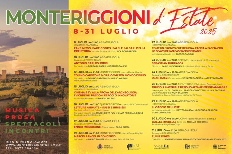 «Il cartellone estivo 2025 rappresenta un impegno concreto dell’Amministrazione comunale per promuovere una cultura di qualità – afferma il Sindaco di Monteriggioni Andrea Frosini –. Stiamo proseguendo con la prospettiva che abbiamo delineato in questi anni, ovvero la realizzazione di un ‘brand’ culturale con delle vere e proprie produzioni ‘made in Monteriggioni’. Abbiamo composto un programma che mette in dialogo la nostra identità storica con linguaggi contemporanei, proponendo un’offerta culturale rivolta sia alla cittadinanza sia ai visitatori che ogni anno scelgono Monteriggioni per la sua unicità».