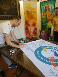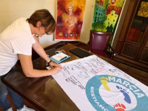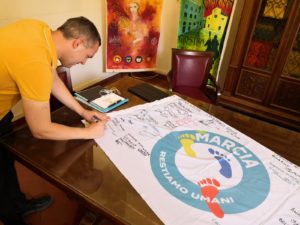 Ad accogliere John Mpaliza e i suoi compagni di viaggio il sindaco di San Gimignano Andrea Marrucci, il vicesindaco Niccolò Guicciardini e l’assessore alle politiche per l’inclusione, solidarietà e sicurezza Daniela Morbis. Per tutti e tre la foto di rito con i partecipanti alla marcia e la firma nella bandiera del progetto “Restiamo umani”.