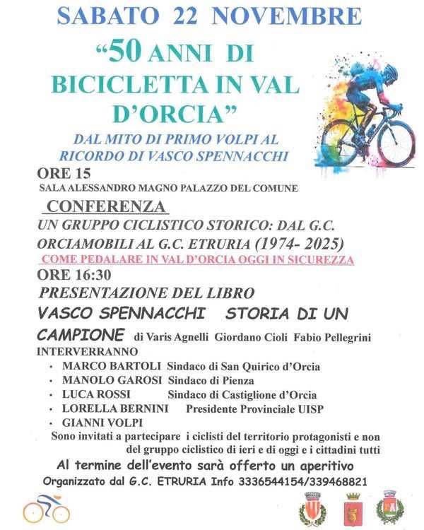 L’appuntamento celebra i 50 anni dell’affiliazione Uisp dell’allora Gruppo Ciclistico Orciamobili, guidato dal presidente Varis Agnelli, oggi alla guida del Gruppo Ciclistico Etruria, erede diretto di quella storica esperienza sportiva. Un’occasione per ripercorrere mezzo secolo di ciclismo tra San Quirico d’Orcia, Castiglione d’Orcia e Pienza: un viaggio che va dal mito di Primo Volpi al ricordo di Vasco Spennacchi, figure che hanno segnato l’identità ciclistica del territorio.