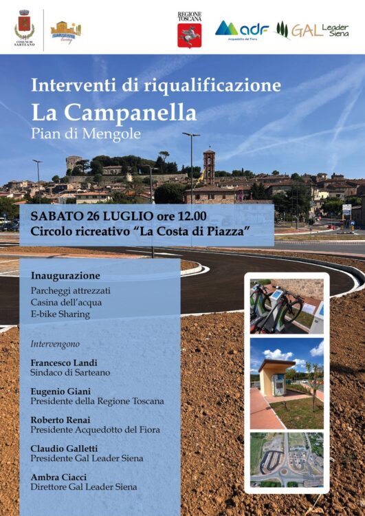“Sarò con noi, durante la mattinata il Presidente Eugenio Giani, a testimoniare la vicinanza dell’Ente alla comunità di Sarteano e, in genere, alle piccole comunità di tutta la Regione. Presenteremo, grazie ad un finanziamento del Consiglio Regionale toscano il Libro della Giostra del Saracino, manifestazione storica che unisce cittadini e contradaioli sarteanesi e, a seguire, le opere di riqualificazione del Parcheggio de La Campanella: oltre 700.000 euro di investimenti alle porte del centro storico realizzati dal Comune grazie al bando della Regione a supporto della realizzazione di parcheggi ad uso turistico. Nel parcheggio insistono anche una casina dell’acqua realizzata grazie alla collaborazione con Acquedotto del Fiora ed una postazione e-bike sharing, realizzata insieme agli altri comuni della Valdichiana Senese grazie a risorse GAL Leader. Per questo interverranno sia Roberto Renai, presidente dell’acquedotto che Claudio Galletti, Presidente del Gal Leader” ha spiegato il Sindaco Francesco Landi.