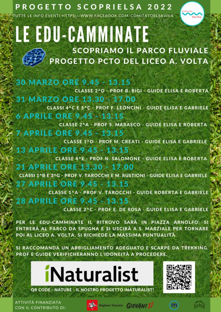 Il Comitato Civico Elsa Viva ringrazia il Liceo Volta e la dirigente Lucia Papini per la disponibilità a sviluppare insieme le Edu-Camminate, dimostrando così una particolare sensibilità alle tematiche ambientali oltre che a metodi di insegnamento moderni ed alternativi alle lezioni classiche. Si ricordano, tra tutte le persone impegnate, Roberta Pistolesi e Marco Rustioni. Le guide ambientaliste che accompagneranno gli studenti lungo il SentierEls sono Elisa Gabbricci, Roberta Landi e Gabriele Giorgio.