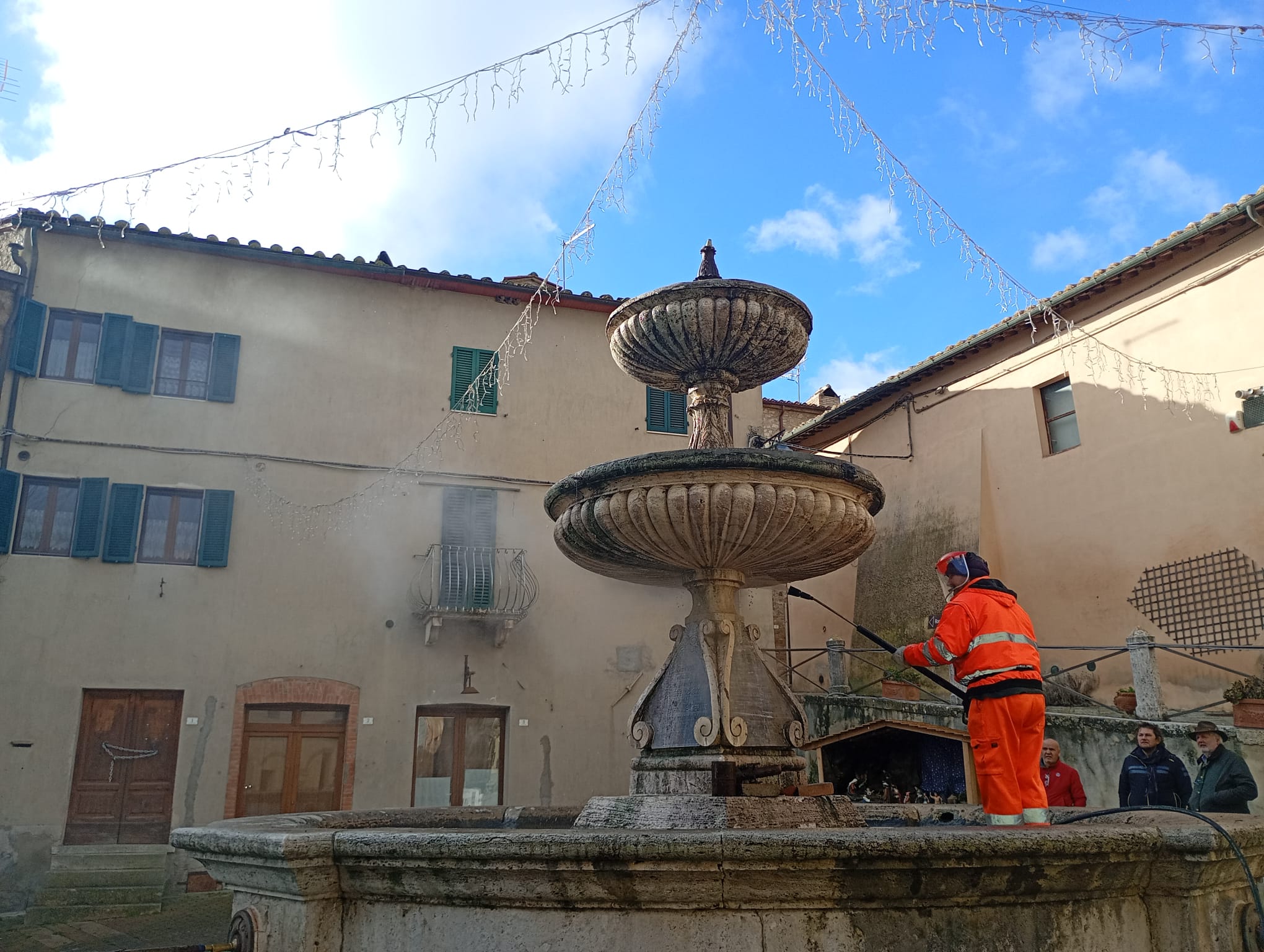 CASTIGLIONE D’ORCIA. Si è svolto nella mattinata di ieri, su indicazione del sindaco Luca Rossi, un intervento straordinario di pulizia e igienizzazione della storica fontana e degli arredi urbani di piazza Unità d’Italia, uno dei luoghi simbolo del centro storico di Castiglione d’Orcia.