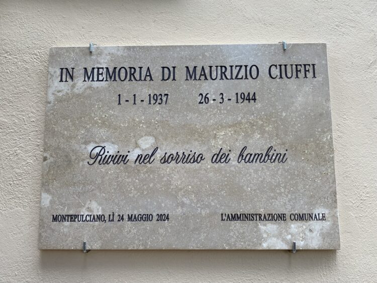 Per ricordare questo nobile gesto, l’Amministrazione Comunale di Montepulciano ha raccolto un sentimento diffuso di riconoscenza di tanti cittadini della comunità di Abbadia nei confronti della famiglia Ciuffi e, di concerto con i familiari e con le istituzioni scolastiche, ieri, venerdì 24 maggio, ha posizionato una targa per ricordare il piccolo Maurizio Ciuffi, scomparso ormai 80 anni fa, il 26 marzo 1944 e onorare al meglio il bel gesto del padre Italo. Un gesto simbolico che va a riempire un vuoto che si era creato quando una prima effige che ricordava il piccolo Maurizio era andata perduta col tempo, a seguito di alcuni lavori sull’immobile.