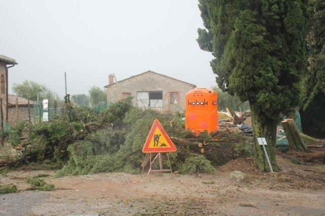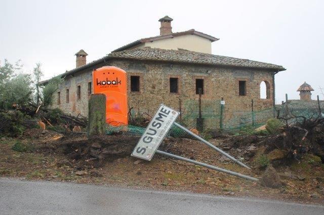 CASTELNUOVO BERARDENGA. (a. p.) Durante la notte, la violenza del vento aggredisce l’incrocio della strada fra San Gusmè e Santa Chiara, finendo per sradicare cipressi secolari e olivi trentennali, ferendo la casa sull’incrocio, vuota da tanti anni, famosa per la meraviglia del suo glicine che fiorisce al bordo della strada.