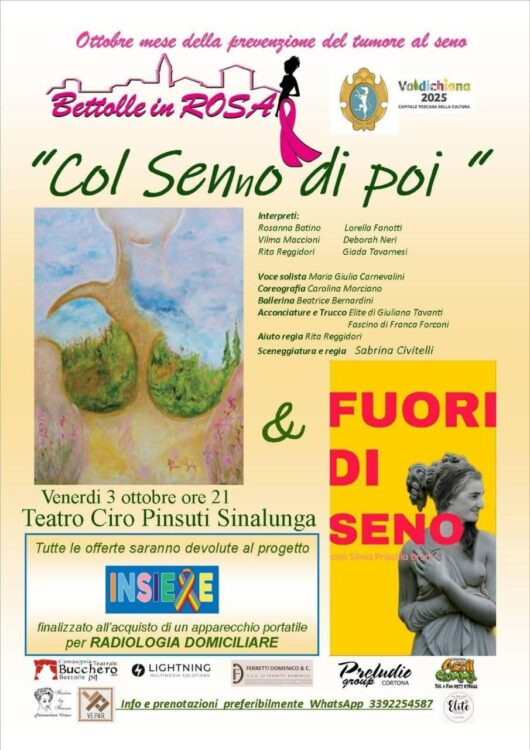 Venerdì 3 ottobre alle ore 21, al Teatro Ciro Pinsuti di Sinalunga, il sipario si alza su “Col senno di poi”, a cura dell’associazione Bettolle in Rosa. Questo spettacolo teatrale porta in scena il tema delicato del tumore al seno e l’importanza della prevenzione con un tono leggero e ironico. Tutte le offerte saranno devolute al progetto “Insieme” finalizzato all’acquisto di un apparecchio portatile per radiologia domiciliare.