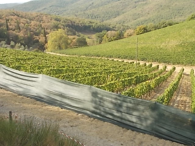 Questo telo ha creato un corridoio fra la rete di protezione metallica e i filari delle viti; se è stata messo per contenere gli ungulati è tutto da verificare nella sua efficacia. Ma di certo lo sfregio che ne subisce il paesaggio è veramente notevole.