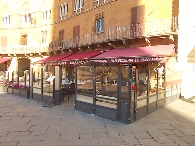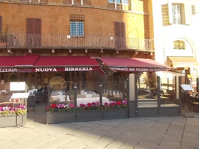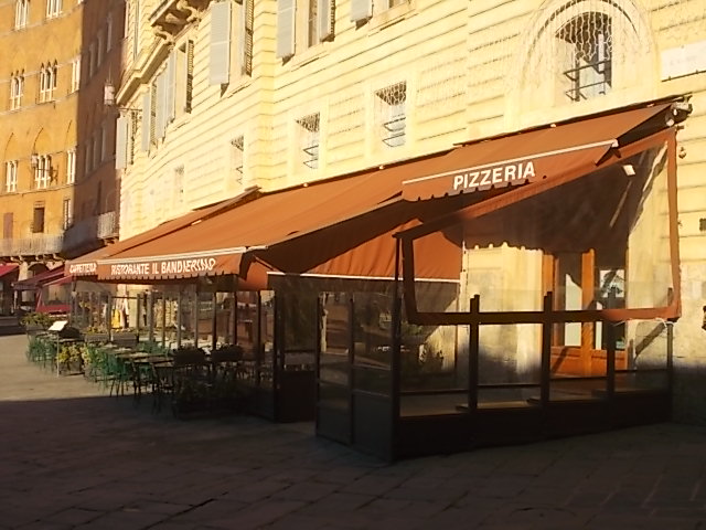 Prendere un caffè seduti in Piazza del Campo è un momento conviviale e piacevole, ma anche un’emozione se si alza la testa e lo sguardo dalla lista dei cocktail e delle noccioline. Davanti a vari locali in piazza sono comparse da anni varie strutture in vetro, ferro e legno come capanni, che permettono di accogliere più clienti all’esterno del locale, occupando però un ampio spazio nell’anello del passeggio e offuscando la bellezza e la visuale di ciò che l’antico senese ha messo in piedi.