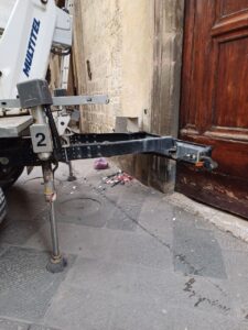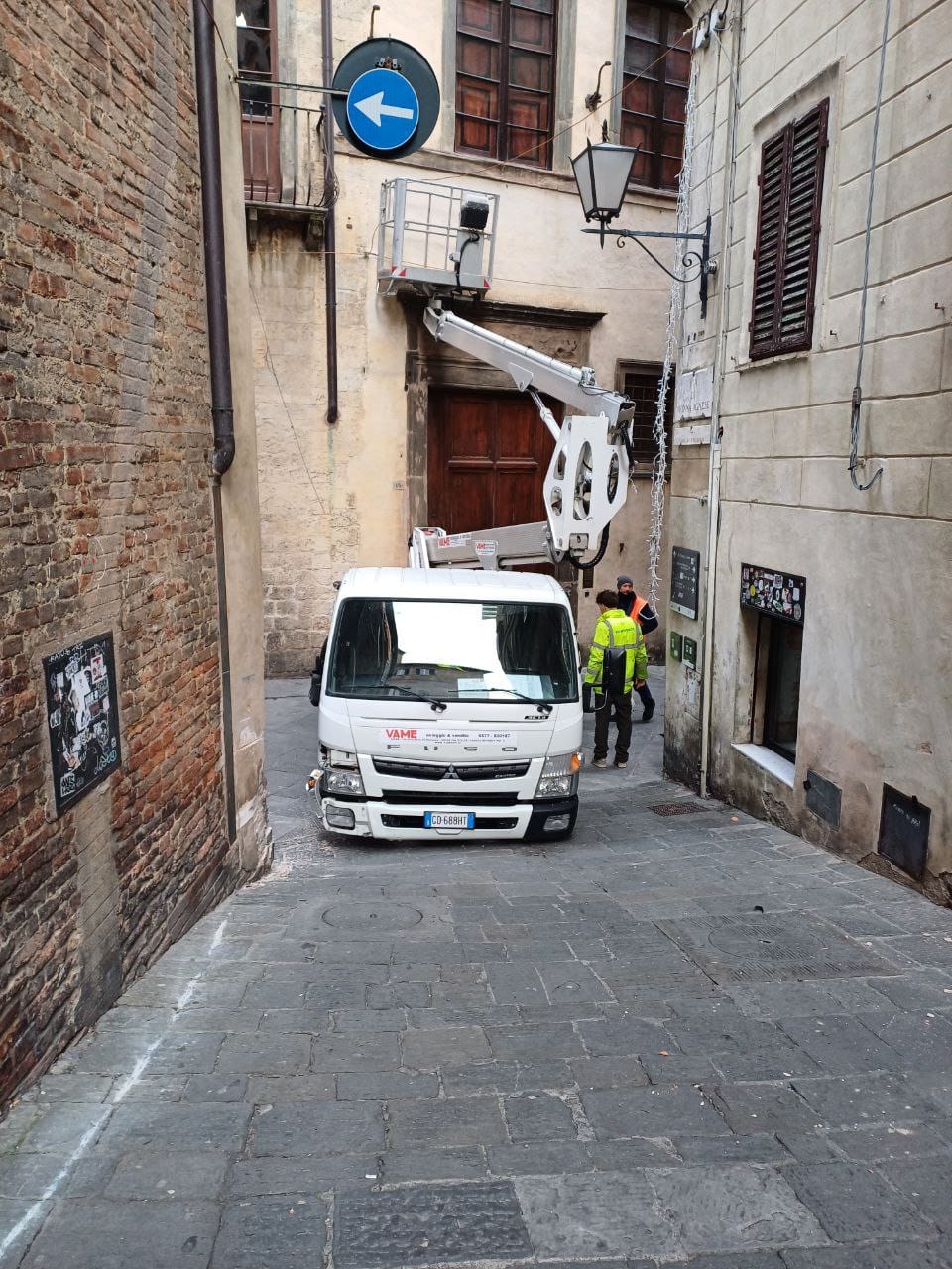 SIENA. Intervento della Polizia Locale e dei Vigili del Fuoco nel tratto di via di Monna Agnese, che si interseca con via dei Pellegrini, per sfrenatura di un automezzo che stava effettuando alcune lavorazioni.