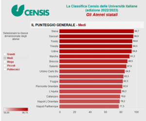 Apre la classifica dei medi atenei statali (da 10.000 a 20.000 iscritti) l’Università di Siena, che soffia il primato all’Università di Trento, che scende in terza posizione, preceduta dall’Università di Sassari (96,0).