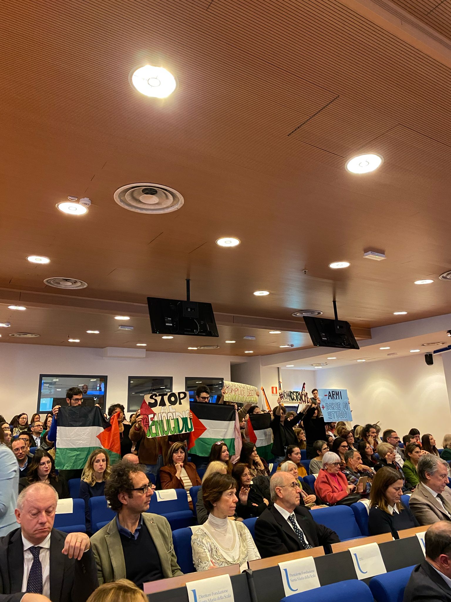 Non staremo alla mercé di queste retoriche da evento accademico intoccabile e anche per questo invitiamo tutta la cittadinanza ad unirsi al corteo per la Palestina, venerdì 23 febbraio alle 17:00 in Piazza San Domenico.