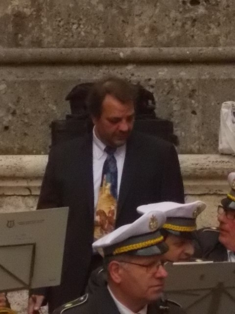 Il maestro Giuseppe Baldesi con una pettinatura da viaggio in vespa ha diretto brani di musiche di Giuseppe Verdi, Johannes Brams, Jacob De Hann, con un omaggio ai grandi compositori Nino Rota ed Ennio Morricone.