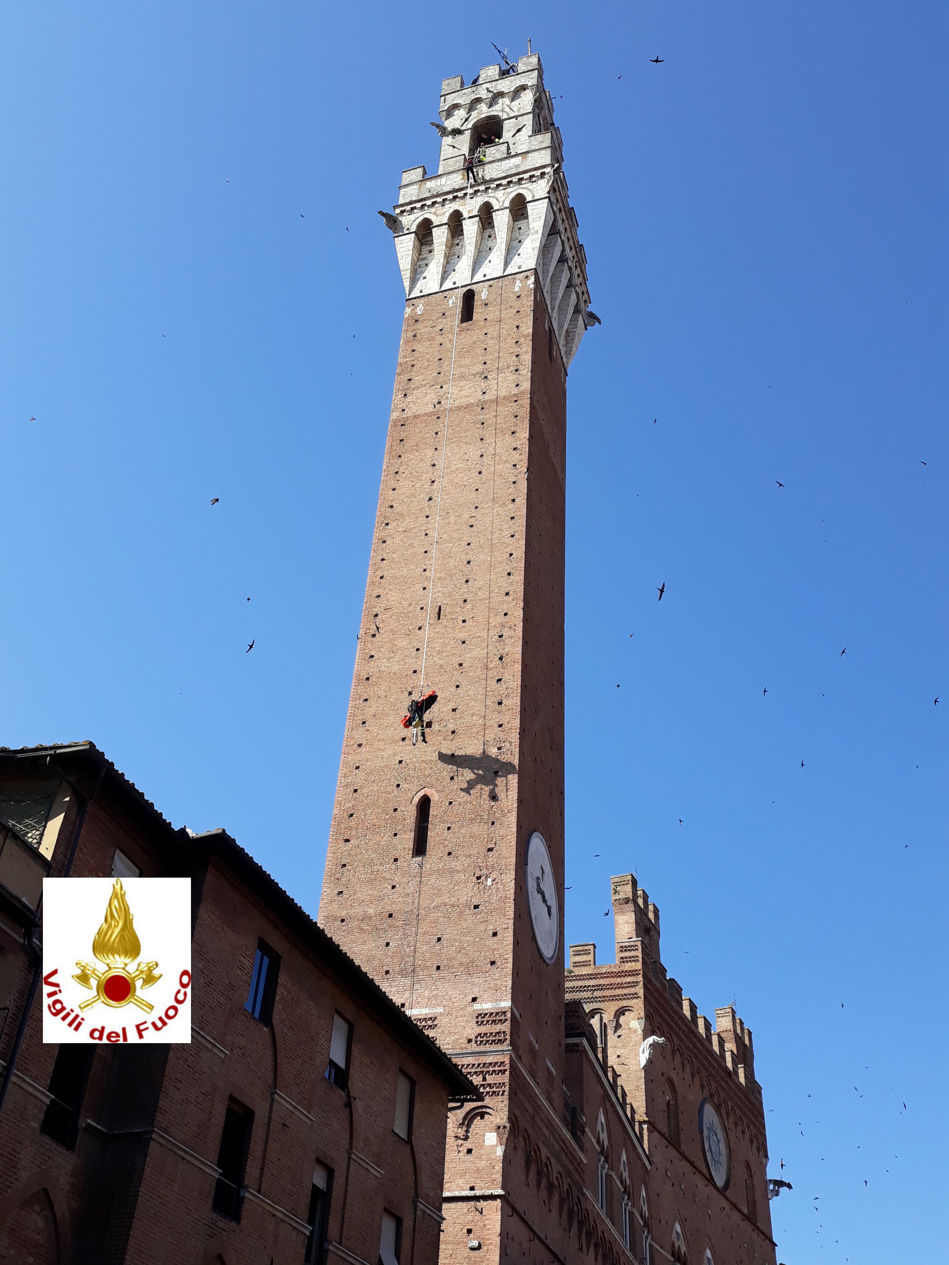 L’esercitazione, promossa con la fattiva collaborazione del Comune di Siena, è stata condotta da 8 unità del Comando di Siena ed ha riguardato la simulazione di un soccorso a persona dalla sommità della torre; la persona soccorsa è stata calata su di una barella da un’altezza di circa 90 metri, esternamente alla Torre, mediante un sistema di funi approntato con tecniche SAF (speleo alpino fluviali) dal personale dei Vigili del fuoco.