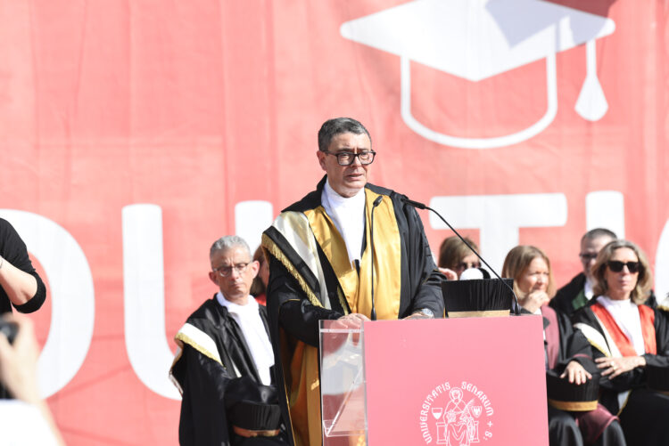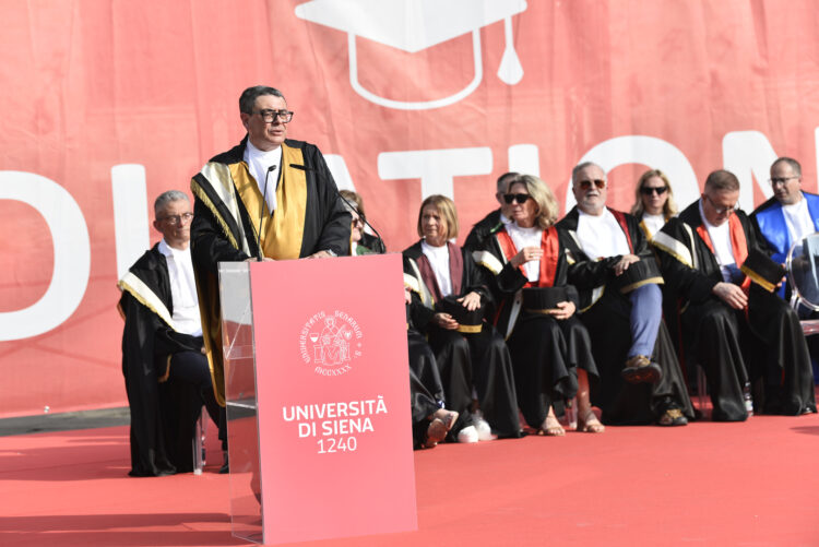 Il rettore Roberto Di Pietra ha quindi salutato e ringraziato i partecipanti, i loro congiunti ed amici e le numerose autorità accademiche civili, militari e religiose presenti. Un ringraziamento al Comune di Siena per l’utilizzo della piazza e la collaborazione allo svolgimento dell’importante evento accademico.