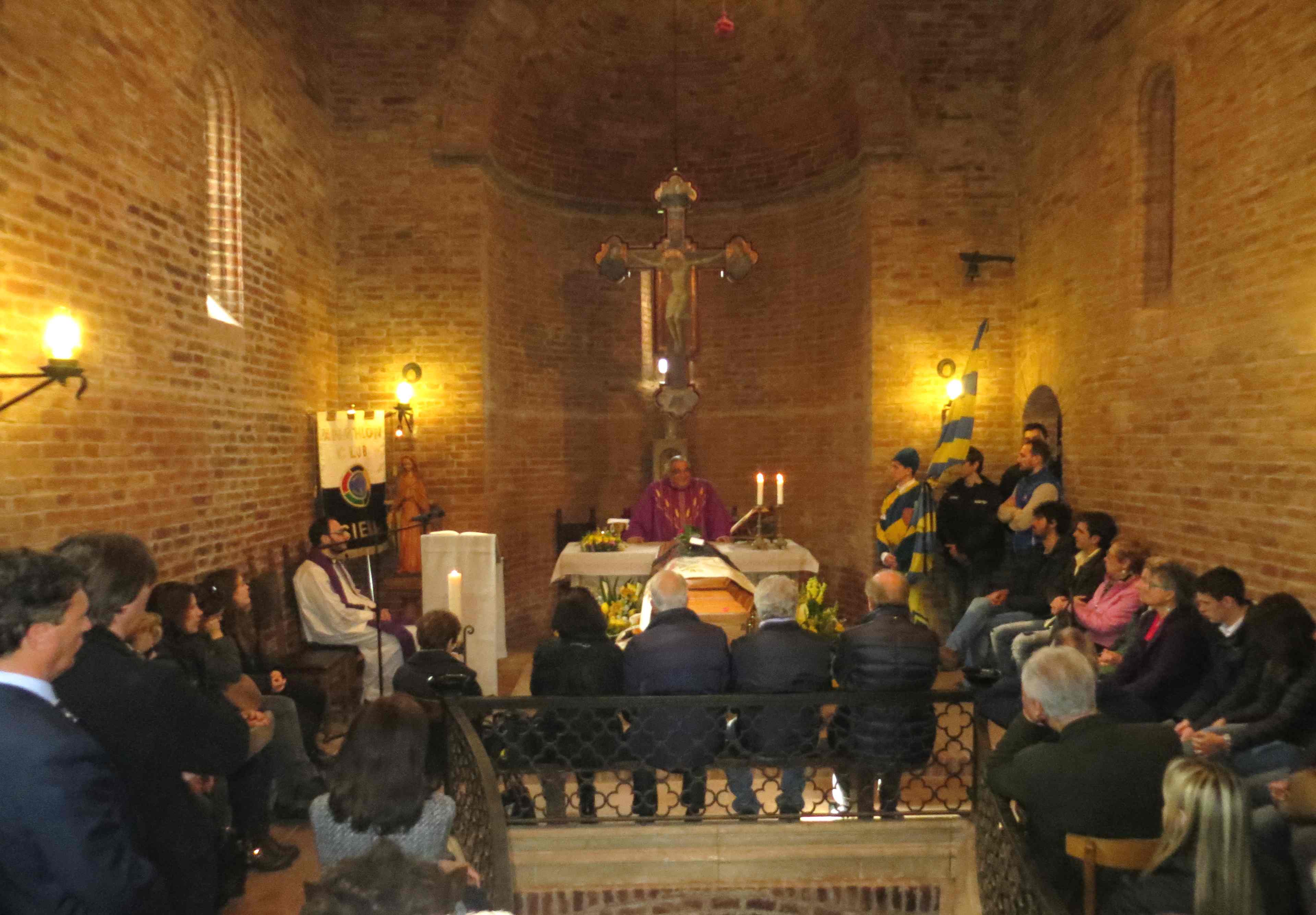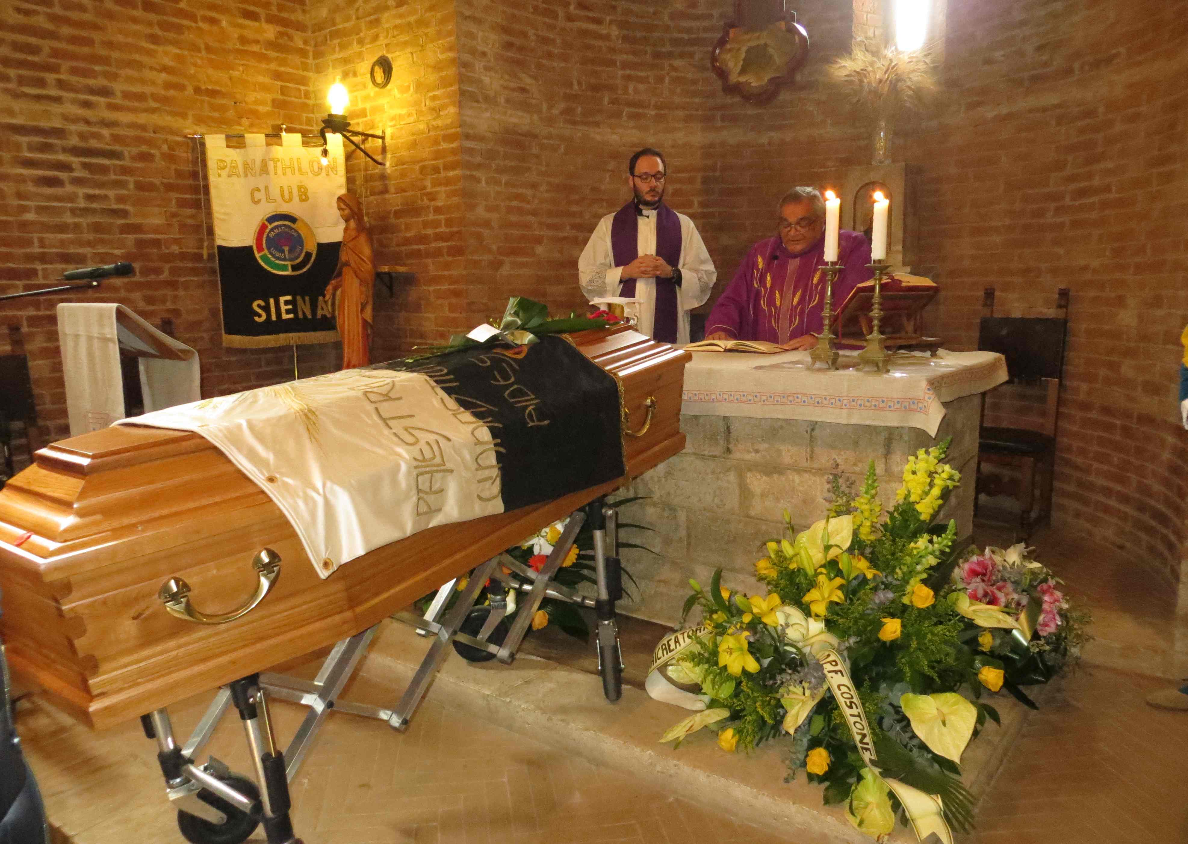 SIENA. Aldo Ricci ha salutato per l’ultima volta il suo Costone, quaggiù, nel luogo che lui sin da piccolo ha amato e frequentato assiduamente. Adesso, da lassù, veglierà su tutti noi con quel fare paterno che lo ha sempre contraddistinto. Le esequie funebri si sono svolte nella mattinata di sabato 2 aprile presso la chiesetta del Ricreatorio Pio II, celebrate da mons. Gaetano Rutilo e don Emanuele Salvatori, una celebrazione seguita in grande silenzio dai molti amici presenti che hanno voluto stringersi attorno alla famiglia di Aldo in unico grande abbraccio. Molto toccanti le parole di don Gaetano che nell’omelia ha ricordato Aldino come un infaticabile trascinatore nel suo lungo mandato da presidente del Costone Basket. Anche Roberto Bruttini al termine della cerimonia ha espresso sentimenti sinceri e commoventi a nome di tutti i Costoniani. Poi il feretro, avvolto nell’antica seta del labaro della Fides, è stato portato a spalla lungo il viale del Ricreatorio e su per la ripida Piaggia, dai giocatori del Costone, fino a Piazza San Giovanni, dopodiché il carro funebre si è mosso verso il Cimitero della Misericordia, dove Aldo Ricci riposerà vicino all’amato figlio Roberto, scomparso tristemente nel giugno del 2013.