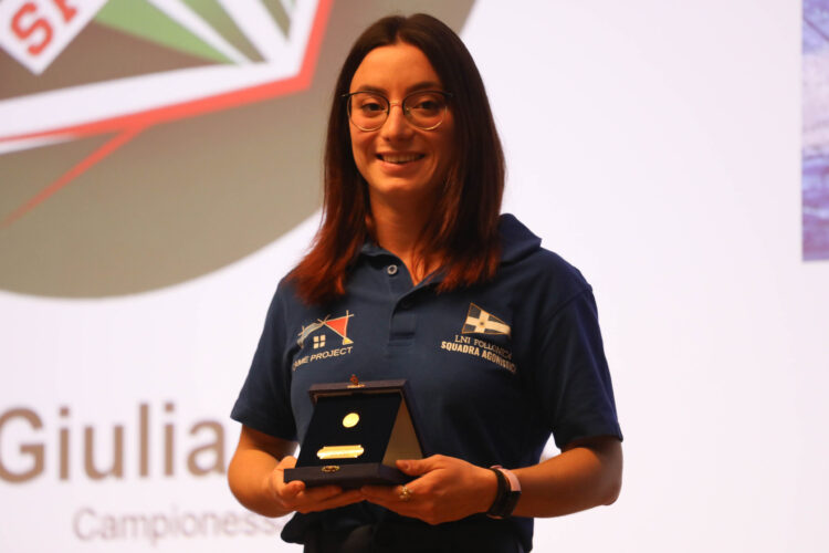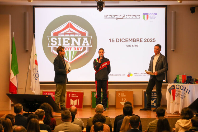 SIENA. La foto di gruppo scattata sul palco dell’auditorium Santa Chiara Lab a fine evento rappresenta la sintesi di un pomeriggio di grande festa. A far festa, appunto, sono state le eccellenze dello sport senese, che Gruppo Stampa Autonomo Siena e C.O.N.I. delegazione provinciale hanno riunito lunedì 15 dicembre nell’ambito del Siena Sport Day, evento che dal 2021 assegna premi e riconoscimenti a atleti e società protagonisti nel corso dell’anno: un’edizione a tinte fortemente rosa, con i premi Sportivo dell’Anno consegnati da Giovanna Romano (presidente Gruppo Stampa) nelle mani di Sofia Paola Chiumiento (Mens Sana 1871) e Giulia Galletti (LNI Follonica), neo-campionesse mondiali rispettivamente nel pattinaggio corsa e nella vela , e con la menzione d’onore ricevuta da Lisa Angiolini (Virtus Buonconvento/Centro Sportivo Carabinieri) giusto una manciata di giorni dopo la splendida settimana che ha visto la ranista dominare gli assoluti di nuoto con tre titoli più il nuovo record italiano sui 200 metri, ma applausi e menzione d’onore pure per Edoardo Pannini (Mens Sana Basketball), capitano e bandiera della pallacanestro biancoverde.