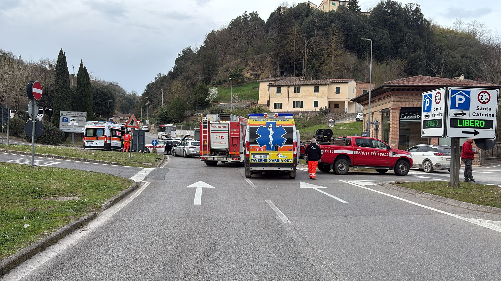 Forti rallentamenti al traffico, con la circolazione provvisoriamente deviata su una parte dello svincolo con Esterna Fontebranda. Sul posto la Polizia Locale, i Vigili del Fuoco e il soccorso sanitario.