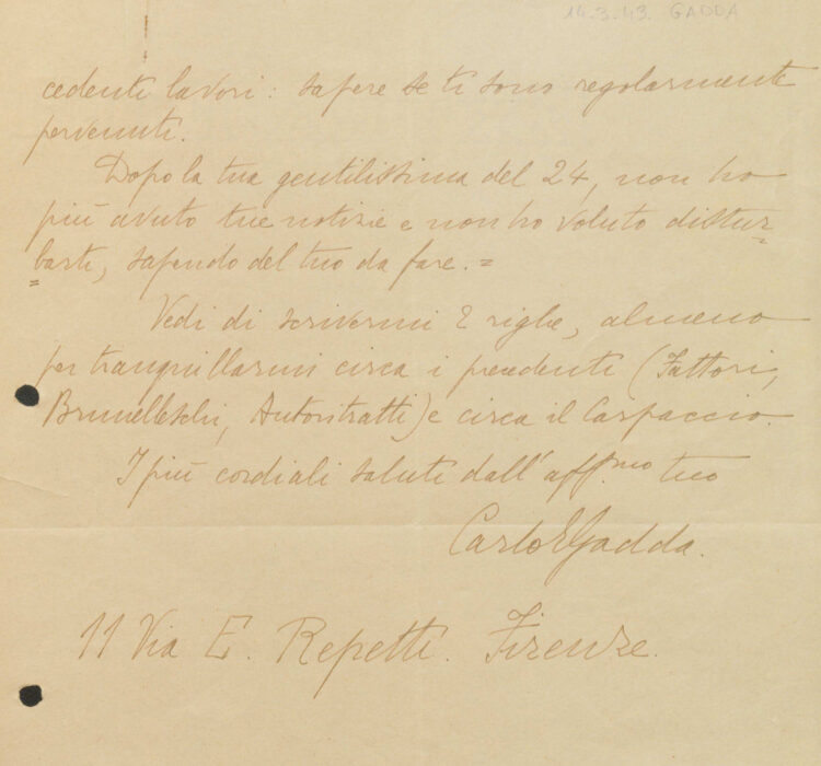 In allegato al presente comunicato alcune immagini del materiale archivistico acquisito; si tratta di una lettera autografa di Carlo Emilio Gadda e di una lettera con firma autografa di Le Corbusier, entrambe del 1949.