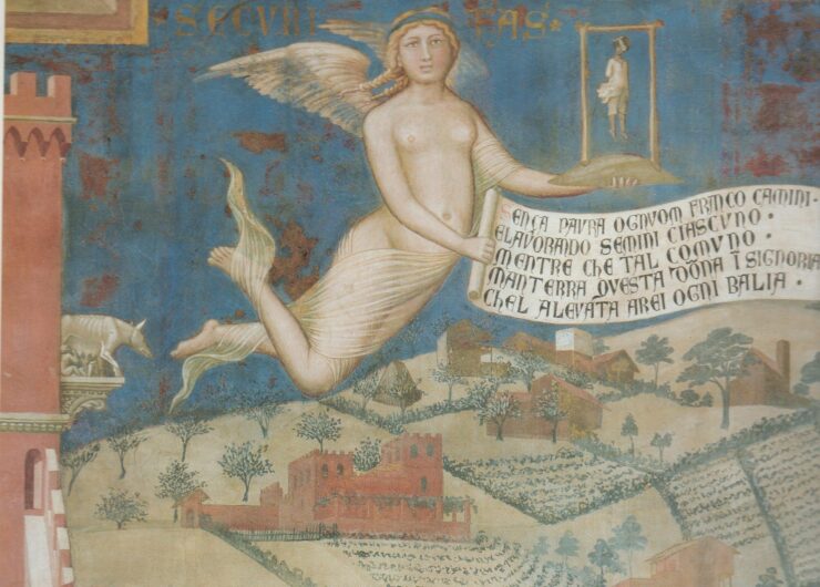 Così imposero che la strada e l’acqua, da “private”, diventassero “pubbliche”. Ambrogio Lorenzetti non mancò di illustrare questo particolare negli “Effetti del Buongoverno”. Sulla campagna domina la “Securitas”, una bellissima figura alata, uno dei primi nudi della pittura medievale, che con una mano regge un criminale impiccato e con l’altra questo cartiglio: “Senza paura ogn’om franco cammini e lavorando semini ciascuno mentre che tal comune manterrà questa donna in signoria che ha levato ai rei ogni balia”.