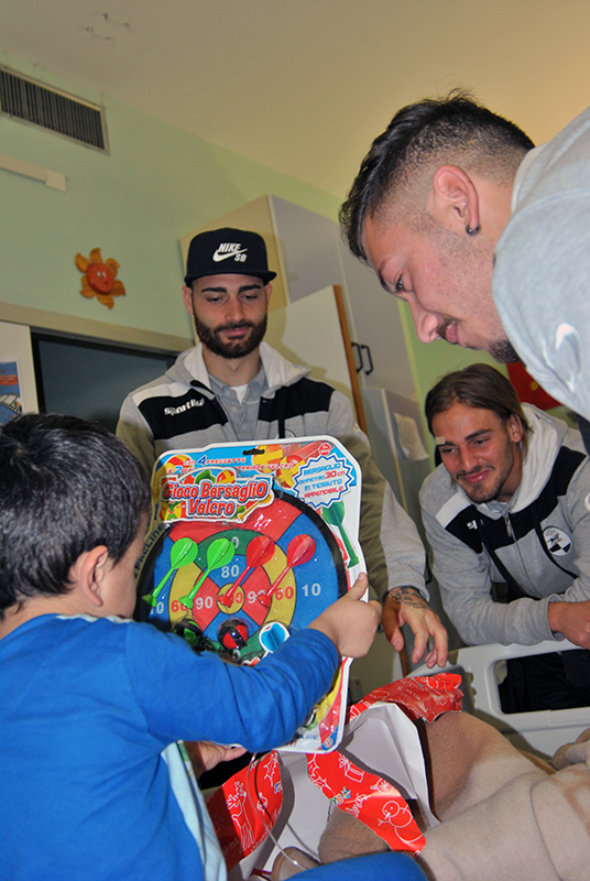 SIENA. Ancora sorprese per i piccoli degenti del Dipartimento Materno-Infantile dell’Azienda ospedaliero-universitaria Senese. Dopo la visita delle Forze dell’ordine, questa mattina è stata la delegazione della Robur Siena a recarsi al policlinico Santa Maria alle Scotte con un carico di regali e auguri per i giovani pazienti. A fare gli onori di casa il professor Salvatore Grosso, direttore della Pediatria, e gli altri professionisti del Dipartimento. Presente all’iniziativa la presidente della Robur Siena Anna Durio, l’allenatore Michele Mignani ed il suo vice Simone Vergassola, e alcuni calciatori. La delegazione bianconera ha fatto poi visita alla Casa Accoglienza per le mamme della Fondazione “Danilo Nannini” e anche ai bimbi ricoverati nella UOC Neuropsichiatria Infantile diretta dal dottor Joussef Hayek.