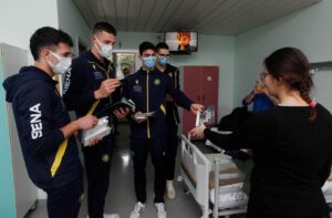 SIENA. La squadra di pallavolo è stata questa mattina nei reparti di Pediatria e di Chirurgia pediatrica dell’ospedale delle Scotte. In rappresentanza del club senese c’erano l’opposto Gabriele Nelli, gli schiacciatori Claudio Cattaneo e Matteo Alpini, il centrale Victorio Ceban, e il vicepresidente Fabio Mechini.
