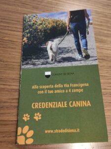 https://stradedisiena.it/via-francigena-a-quattro-zampe, sarà possibile conoscere i punti ufficiali di distribuzione delle credenziali canine, una sorta di passaporto disponibile gratuitamente per il viandante che vorrà attraversare la Francigena insieme al suo Fido.