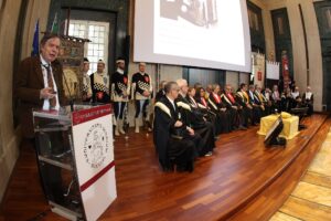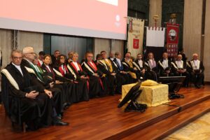 Dopo il Corteo accademico e il saluto dei Goliardi senesi, la cerimonia è stata aperta dalla Relazione del Rettore Roberto Di Pietra su “Cosa sono e fanno le Università? Come contemperare identità e cambiamento”. Al centro della sua analisi la necessità di (ri)definire cosa sono oggi le Università. “Visto che le Università sono istituzioni che esistono (o forse resistono) da tanto tempo – ha detto il Rettore – proprio in questo tempo occorre dirsi cosa sono le Università e cosa fanno. Proprio ora occorre una definizione aggiornata di quello che sono le Università nel ventunesimo secolo”. L’approdo deve essere una formulazione chiara e condivisa, che riguardi tanto il livello nazionale che quello dell’Unione Europea: “la prospettiva futura delle Università deve ‘immaginare’ un futuro pieno di incognite e di ostacoli da superare attraverso una capacità che è quella di reinventarsi mantenendo la loro identità. Le Università devono essere, allo stesso tempo, resistenti e mutevoli”. Partendo dall’esigenza di costruire un futuro a medio e lungo termine strettamente legato al passato, il professor Di Pietra ha indicato tre passaggi chiave per lo sviluppo dell’Ateneo senese: riprogettare la struttura dipartimentale, definire una nuova e diversa struttura organizzativa incentrata sui “processi”, ridefinire, razionalizzare e coordinare l’offerta formativa.