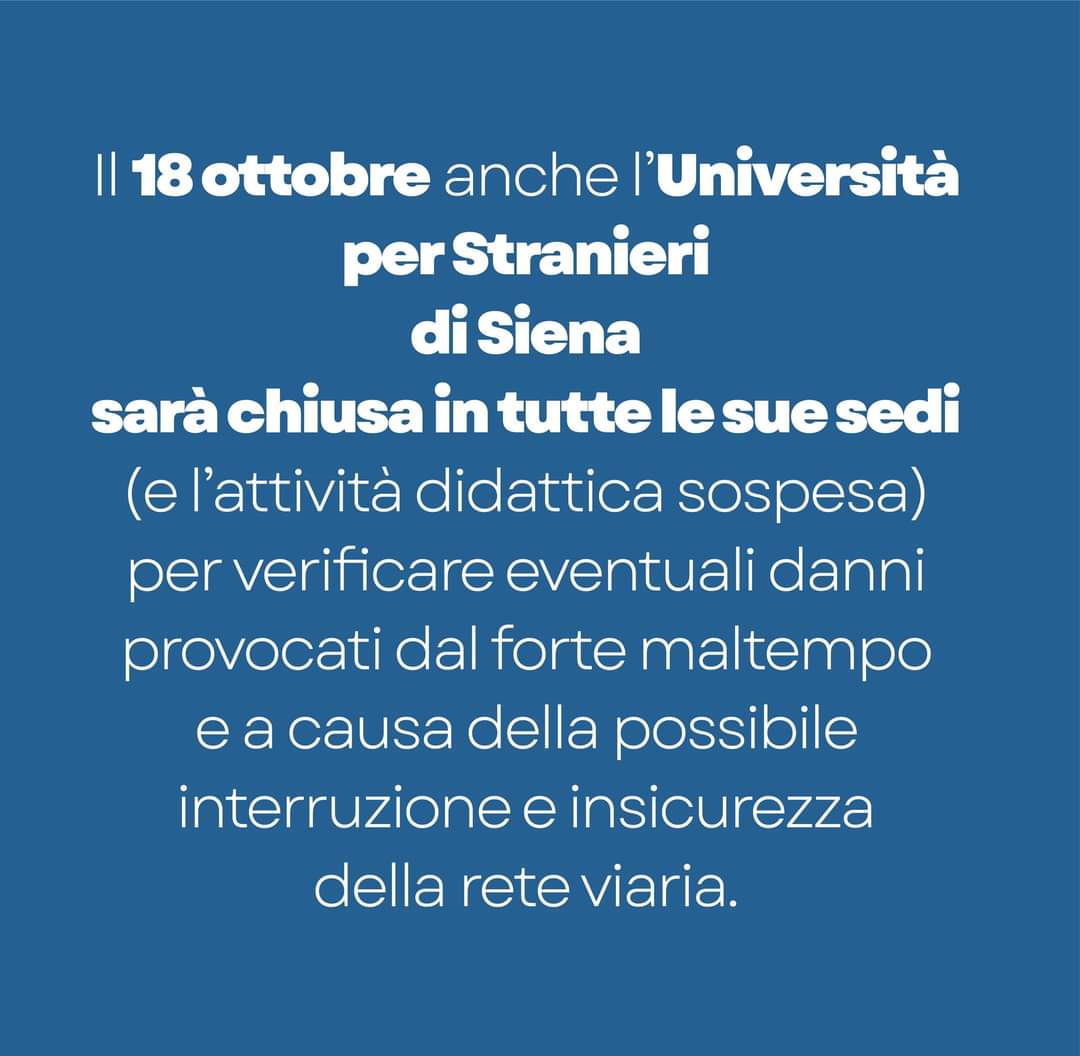 SIENA. Il 18 ottobre anche l’Università per Stranieri di Siena sarà chiusa in tutte le sue sedi (e l’attività didattica sospesa) per verificare eventuali danni provocati dal forte maltempo e a causa della possibile interruzione e insicurezza della rete viaria.