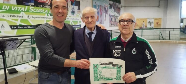 SIENA. Una festa tutta biancoverde. È quella che si è tenuta nei giorni scorsi al PalaGiannelli, dove Romano Borgogni, storico atleta e allenatore mensanino, ha spento 85 candeline. Nell’occasione, il presidente della Polisportiva Mens Sana 1871, Antonio Saccone, ha voluto omaggiare questo momento con la consegna di una pergamena, per celebrare i tanti anni passati con i ‘guantoni biancoverdi’.